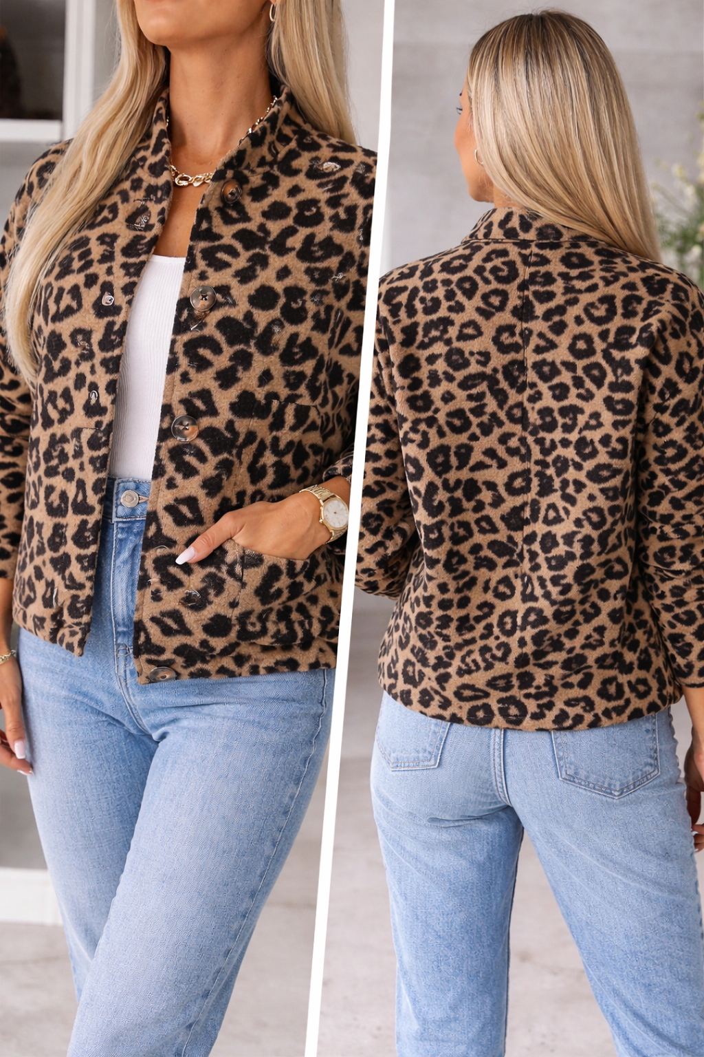 The Charlene Trendy Jacket brings together timeless pattern and everyday comfort in one effortlessly striking piece. Designed in a refined leopard print, it adds character and depth to your wardrobe while maintaining a polished, wearable feel.
